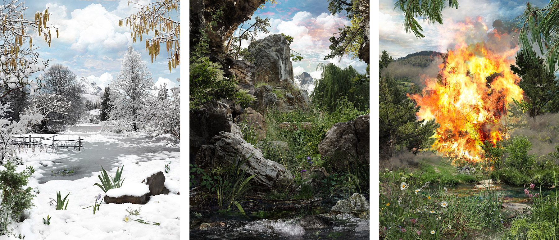 La serie ironiza sobre estas imágenes estandarizadas –el pico de montaña impecable, el bucólico lago con cascada, el clásico atardecer con palmeras– que se replican a sí mismas como si fueran una postal y sugiere una crítica al concepto mismo de parque natural entendido como un enclave idílico y encapsulado, como si fuera un paisaje hecho monumento, que poco tiene que ver con la realidad medioambiental. Porque la imagen que mejor representa la naturaleza contemporánea no es ni la icónica cumbre del monte Cervino ni la enésima puesta de sol tropical, sino la de un bosque en llamas.